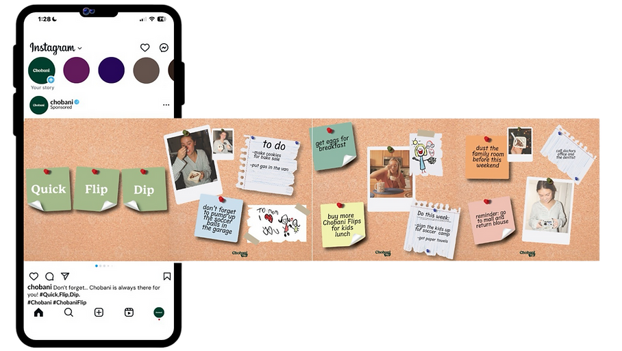 One of the many social media posts, a carousel post was created for Instagram to connect with the target audience, who are active users of the platform. The post featured a bulletin board with sticky notes and reminders, using Chobani as a playful prompt to snack. The tagline was included in the copy and as a hashtag, making it easy for viewers to engage with Chobani Flips and the broader brand.